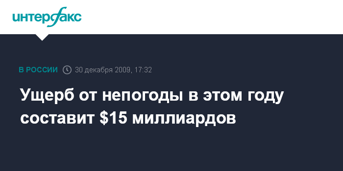 Москва. 30 декабря. INTERFAX.RU – Экономический ущерб от опасных погодных явлений в мире в текущем году составил $15 млрд, сообщил директор Гидрометцентра РФ Роман Вильфанд.