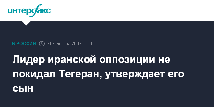 Тегеран. 31 декабря. ИНТЕРФАКС - Лидер иранской оппозиции Мехди Кярруби не покидал в среду Тегеран, утверждает его сын Хосейн.