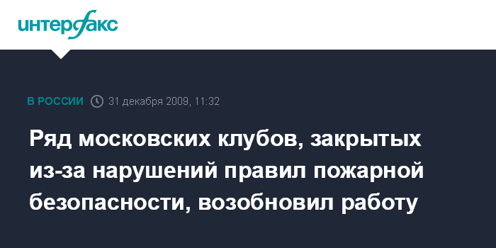 Москва. 31 декабря. INTERFAX.RU - Некоторые московские клубы, которые были ранее закрытые по решению суда из-за нарушений правил пожарной безопасности, в канун Нового года возобновили работу.