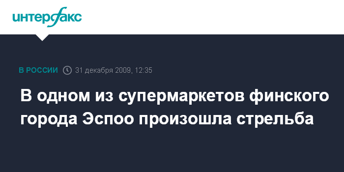 Москва. 31 декабря. INTERFAX.RU - Стрельба произошла в четверг в одном из супермаркетов в финском городе Эспоо, передает финская национальная телерадиокомпания ЮЛЕ. По первоначальным данным, мог пострадать один человек. Других подробностей инцидента пока нет.