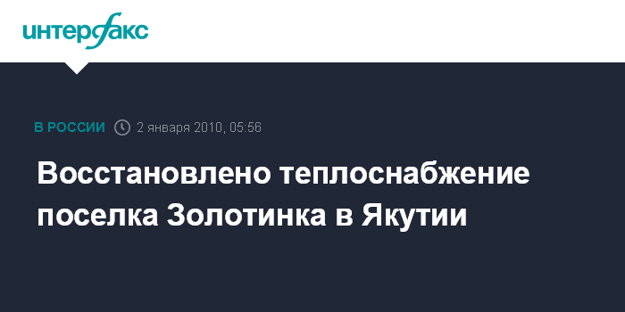 Хабаровск. 2 января. ИНТЕРФАКС - ДАЛЬНИЙ ВОСТОК - Подача тепла в жилые дома поселка Золотинка в Якутии восстановлена.