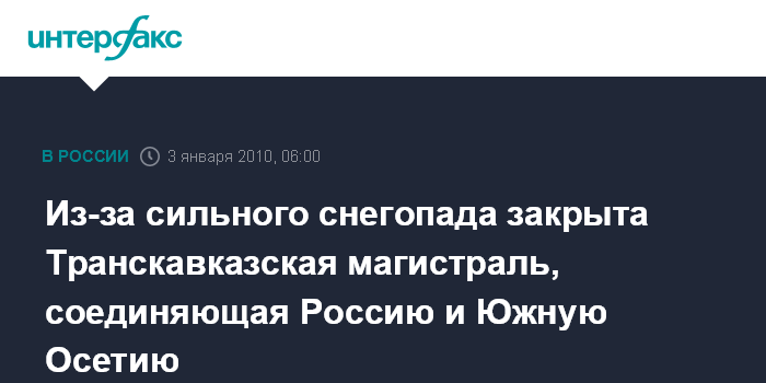 Владикавказ. 3 января. ИНТЕРФАКС-ЮГ - Транскавказская магистраль, соединяющая Северную Осетию с Южной, закрыта из-за сильного снегопада.