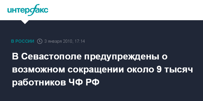 Москва. 3 января. INTERFAX.RU – В Севастополе предупреждены о возможном сокращении около 9 тысяч гражданских работников подразделений Черноморского флота РФ.