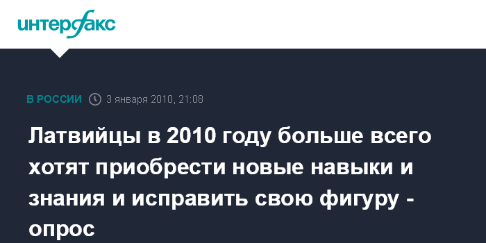 Рига. 3 января. ИНТЕРФАКС/BNS - 47% жителей Латвии полны решимости в 2010 году приобрести новые навыки и знания, например, овладеть иностранным языком, научиться вязать или работать на компьютере, а 43% - больше заниматься спортом и исправить свою фигуру, свидетельствуют результаты опроса, проведенного в декабре Swedbank.