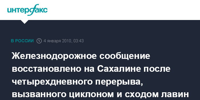Южно-Сахалинск. 4 января. ИНТЕРФАКС-ДАЛЬНИЙ ВОСТОК - Движение поездов Сахалинской железной дороги возобновилось в понедельник утром, сообщили агентству "Интерфакс-Дальний Восток" в пресс-службе СахЖД.