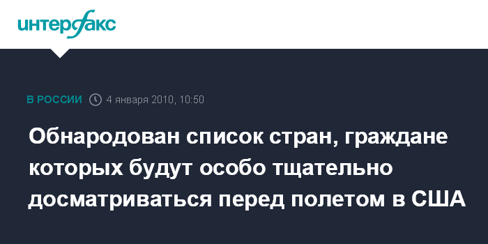 Москва. 4 января. INTERFAX.RU - Американские власти обнародовали полный список стран, граждане которых будут подвергаться обязательному личному досмотру при посадке на самолеты, следующие в США, сообщают местные телеканалы.