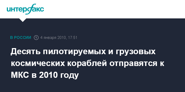 Москва. 4 января. INTERFAX.RU - Россия в наступившем 2010 году выполнит десять космических запусков по пилотируемой программе, сообщили "Интерфаксу-АВН" в Ракетно-космической корпорации "Энергия" (Королев).