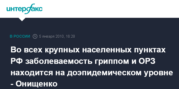 Руководитель Роспотребнадзора, главный государственный санитарный врач РФ Геннадий Онищенко сообщил "Интерфаксу" во вторник, что во всех крупных населенных пунктах страны, включая Москву и Санкт-Петербург, заболеваемость гриппом и ОРЗ находится на доэпидемическом уровне.
