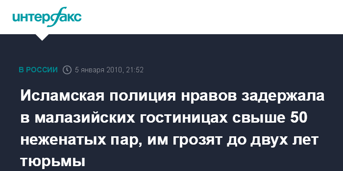 Лондон. 5 января. ИНТЕРФАКС - Власти Малайзии сообщили, что исламская полиция нравов страны задержала 52 неженатые пары, которые встречали Новый год наедине в номерах отелей.