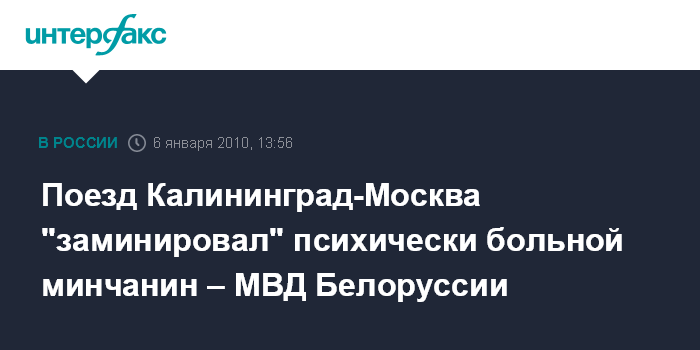 Минск. 6 января. INTERFAX.RU - Правоохранительные органы установили личность злоумышленника, который по телефону сообщил о минировании поезда Калининград-Москва, сообщили агентству "Интерфакс-Запад" в среду в министерстве внутренних дел Белоруссии. "Предварительно установлено, что ложный звонок о минировании поезда Калининград-Москва сделал минчанин, 1970 года рождения, психически больной", - отметили в МВД.