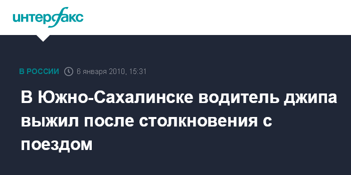 Южно-Сахалинск. 6 января. INTERFAX.RU - Житель Южно-Сахалинска попал в реанимацию после столкновения автомобиля с поездом, сообщили агентству "Интерфакс - Дальний Восток" в пресс-службе УВД Сахалинской области. По словам собеседника агентства, 46-летний водитель джипа "Mitsubishi Pajero" во вторник вечером на окраине Южно-Сахалинска выехал на железнодорожный переезд на запрещающий сигнал светофора. "В результате джип столкнулся с грузовым поездом, двигавшимся с севера на юг. Водитель джипа получил тяжелые травмы: открытую черепно-мозговую травму, ушиб головного мозга, тупую травму живота. В состоянии комы он доставлен в реанимацию областной больницы, где до сих пор находится в тяжелом состоянии", - рассказали в пресс-службе.