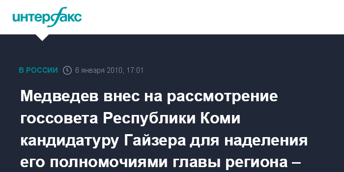 Москва. 6 января. INTERFAX.RU - Президент России Дмитрий Медведев внес на рассмотрение Государственного Совета Республики Коми кандидатуру Вячеслава Гайзера для наделения его полномочиями главы региона, сообщает в среду пресс-служба Кремля. В настоящее время главой Республики Коми является Владимир Торлопов. В.Гайзер (родился 28 декабря 1966 года) до последнего времени работал первым заместителем главы Республики Коми - министром финансов Республики Коми. Он включен в резерв управленческих кадров президента РФ ("первая сотня").
