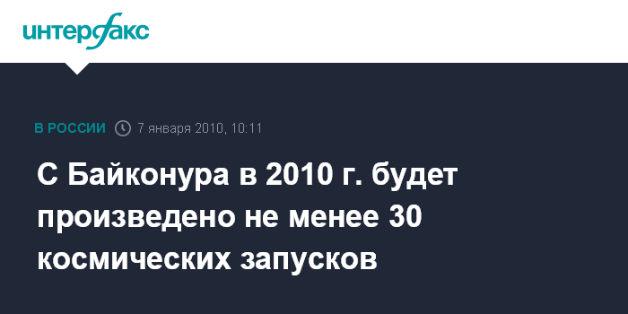 Байконур. 7 января. INTERFAX.RU - С космодрома Байконур в 2010 году планируется осуществить запуск порядка 30 космических ракет-носителей, сообщил агентству "Интерфакс" информированный источник на космодроме.