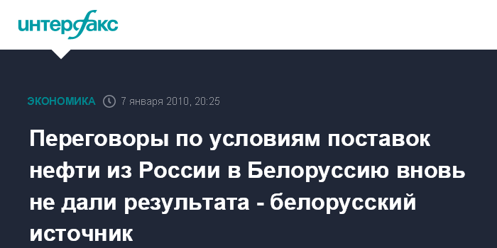 Минск. 7 января. ИНТЕРФАКС-ЗАПАД - Представители России и Белоруссии, проводившие в четверг в Москве очередной раунд переговоров об условиях поставок в республику в 2010 году российской нефти, не смогли достичь компромисса, сообщил агентству "Интерфакс-Запад" близкий к переговорам источник с белорусской стороны.