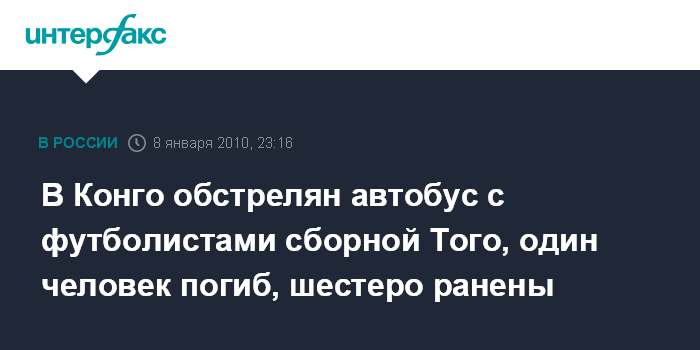 Лондон. 8 января. ИНТЕРФАКС - Автобус со сборной Того по футболу был атакован неизвестными на территории республики Конго, сообщает британская телерадикорпорация "Би-Би-Си" в пятницу.