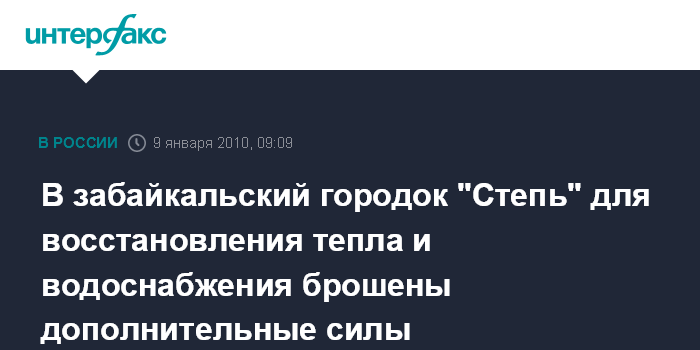 Чита. 9 января. ИНТЕРФАКС-СИБИРЬ - Сибирский военный округ увеличил количество ремонтных бригад в закрытом городке "Степь", где из-за остановки котельной пришлось эвакуировать людей и восстанавливать системы тепло- и водоснабжения жилых домов и социальных объектов.