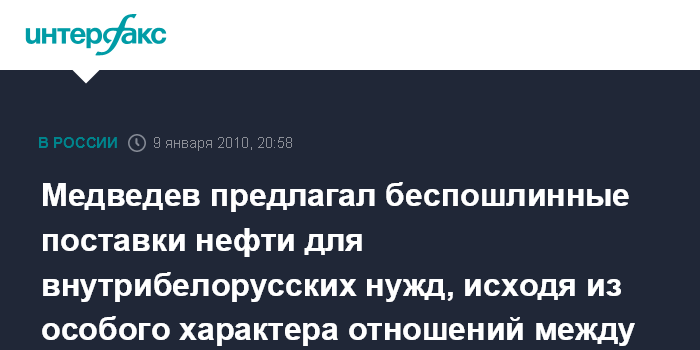 "Предложение о беспошлинной поставке российской нефти для внутрибелорусских нужд в объеме 6,3 млн тонн нефти в год было сформулировано президентом РФ Дмитрием Медведевым в ходе заседания Высшего Госсовета Союзного государства, которое состоялось в декабре прошлого года в Москве, исходя из особого характера отношений между российским и белорусским народами", - сказал "Интерфаксу" в субботу источник в администрации президента РФ.