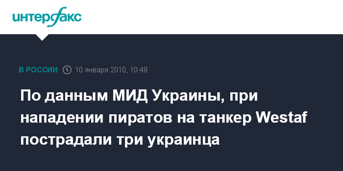 Киев. 10 января. INTERFAX.RU - Трое украинских моряков пострадали в результате нападения нигерийских пиратов на танкер Westaf в районе Лагоса (Нигерия). Как сообщил агентству "Интерфакс-Украина" пресс-секретарь МИД Украины Валерий Джигун, нападение произошло 29 декабря 2009 года, в результате чего пострадали четверо членов экипажа, трое из которых - граждане Украины. Он также рассказал, что пираты ограбили судно и покинули его. Капитан судна, по информации пресс-секретаря МИД, с огнестрельным ранением был госпитализирован, однако на сегодняшний день он и остальные члены экипажа уже чувствуют себя удовлетворительно и вернулись на борт судна.