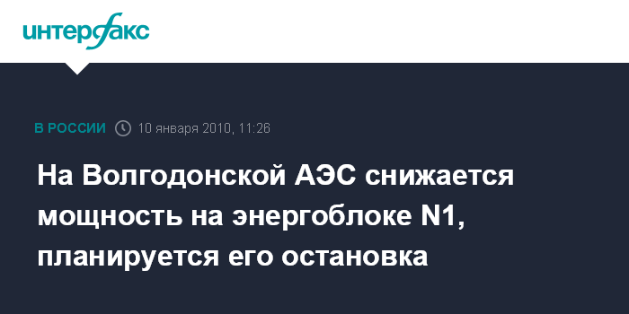 Ростов-на-Дону. 10 января. INTERFAX.RU - Срабатывание аварийной защиты реактора зафиксировано на Волгодонской АЭС. "В 9:20 мск на блоке № 1 сработала сигнализация по активности паропровода второго контура, показывающая протечку трубчатки парогенератора № 1", - сообщили агентству "Интерфакс-Юг" в экстренных службах региона. По словам представителя экстренной службы, согласно регламенту, потребовалась остановка энергоблока № 1. В настоящее время идет снижение его мощности до полной остановки. Радиационный фон в районе Волгодонской АЭС и в пределах окружающей местности нормальный.