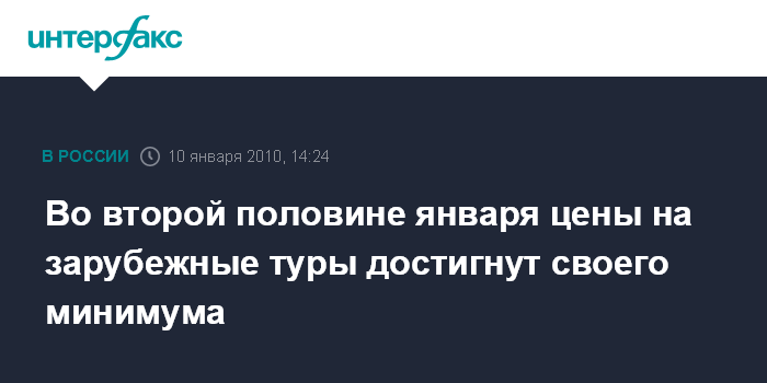 Москва. 10 января. INTERFAX.RU - С середины января до начала февраля на туристическом рынке наступает период минимального спроса, и, соответственно, самых низких цен на зарубежные туры, сообщает портал "Интерфакс-Туризм" со ссылкой на туроператоров. По словам Ларисы Смирновой, коммерческого директора туркомпании "Джет Трэвел", в среднем цены на туры после новогодних праздников падают на 60%, а на отдельных курортах - на все 100% за счет снижения стоимости проживания в отелях, апартаментах и пансионах. "Вообще, одна из самых выгодных за весь год дат для зарубежной поездки - середина января", - добавила собеседница агентства. Вопреки расхожему мнению, как заметил другой эксперт рынка, распродажи в полном объеме начинаются в Европе не перед Рождеством и не после него, а с 6 января и длятся до начала февраля. "Это - самый выгодный период для покупки одежды, обуви, товаров для дома, так как цены на них падают почти вдвое", - сказал он.