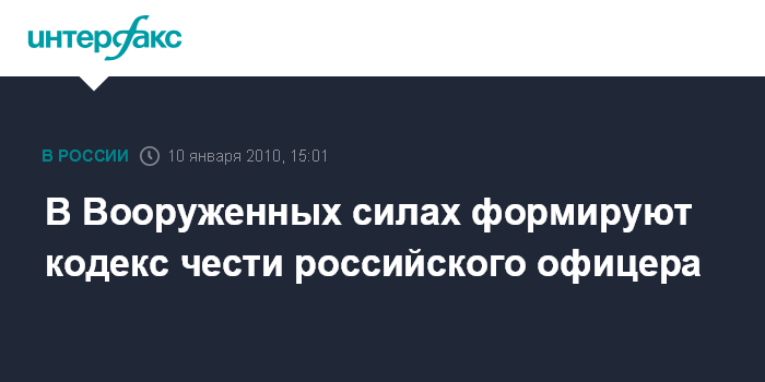 Москва. 10 января. INTERFAX.RU - В 2010 году в Москве пройдет 3-е Всеармейское совещание офицеров армии и флота, посвященное формированию основ корпоративной этики российского офицера в перспективном облике Вооруженных сил, сообщил "Интерфаксу-АВН" источник в российском военном ведомстве. По словам собеседника агентства, до 1 февраля 2010 года в воинских частях, общевойсковых бригадах и на кораблях будет проходить дискуссия по выработке кодекса чести российского офицера. "Под руководством статс-секретаря - замминистра обороны Николая Панкова в войсках будет развернута широкомасштабная дискуссия, связанная с обсуждением кодекса чести российского офицера, основы которого сейчас вырабатываются в Минобороны", - отметил он.