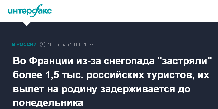 Москва.10 января. ИНТЕРФАКС - Более 1,5 тыс. пассажиров авиакомпании "ВИМ-Авиа" не могут вылететь из Франции из-за снегопада.