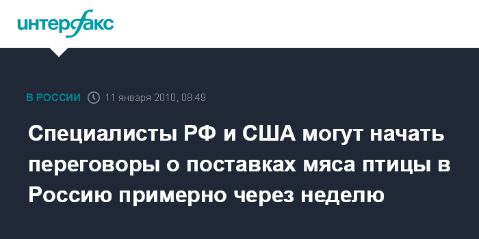 "Это будут переговоры об условиях выполнения американской стороной российских национальных требований по безопасной обработке мяса птицы, которое поступает на российский рынок", - сказал ранее Онищенко. Он сообщил, что мясо птицы после обработки хлором вредно для здоровья.