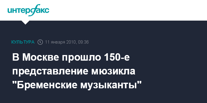 Москва. 11 января. INTERFAX.RU - Пятого января в Москве на сцене ККЗ "Пушкинский" прошло 150-е представление ставшего уже легендарным мюзикла "Бременские музыканты". Дебют мюзикла состоялся 31 января 2009 г. и с тех пор завоевал популярность у москвичей и жителей регионов России. По данным организаторов, с момента выхода мюзикла его посетили свыше 130 тысяч человек, свыше 15% билетов было отдано в детские дома, школы-интернаты, детям с ограниченными возможностями и малообеспеченным семьям.