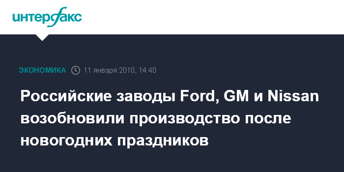Москва. 11 января. INTERFAX.RU - ЗАО "Форд Мотор Компани" (Всеволожск, Ленинградская область), ООО "Джи-Эм Авто" (Петербург) и ООО "Ниссан Мотор Рус" (Петербург) в понедельник возобновили работу конвейера после новогодних праздников, сообщили "Интерфаксу" в компаниях.