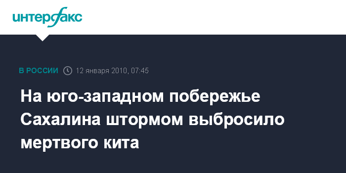 Южно-Сахалинск. 12 января. ИНТЕРФАКС - ДАЛЬНИЙ ВОСТОК - Мертвого кита выбросило штормом в районе Невельска.
