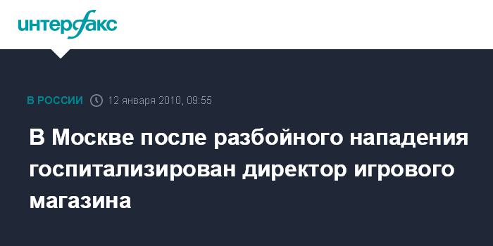 Москва. 12 января. INTERFAX.RU - В Москве совершено разбойного нападение на директора магазина, который специализируется на продаже игровых приставок, аксессуаров к ним и видеоигр, сообщил во вторник "Интерфаксу" источник в правоохранительных органах.