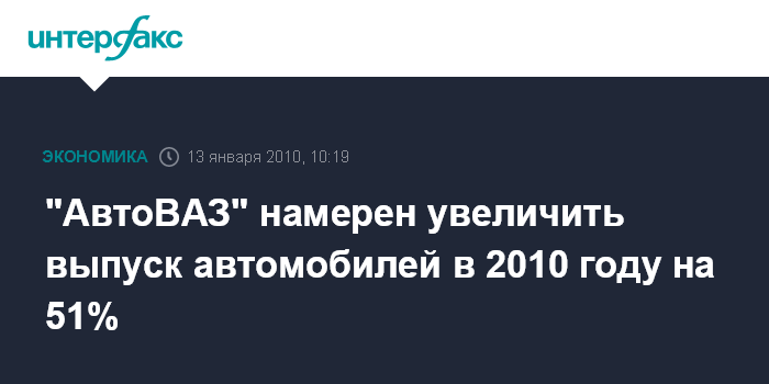Москва. 13 января. INTERFAX.RU – ОАО "АвтоВАЗ" намерено увеличить производство автомобилей в 2010 году на 51% - до 446 тыс., говорится в сообщении компании.