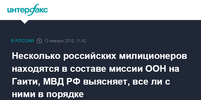Москва. 13 января. INTERFAX.RU – МВД России выясняет судьбу своих сотрудников, которые находятся в составе полицейского контингента на Гаити, где произошло сильное землетрясение, сообщил "Интерфаксу" в среду источник министерстве.