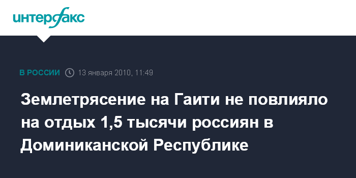 Москва. 13 января. INTERFAX.RU – Землетрясение, произошедшее во вторник на территории Гаити, не затронуло туристическую отрасль соседней Доминиканской Республики, сообщила "Интерфаксу" генеральный директор туркомпании "Капитал Тур" Инна Бельтюкова.