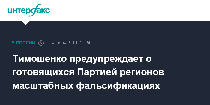Москва. 13 января. INTERFAX.RU - Кандидат на пост президента Украины Юлия Тимошенко заявляет о подготовке масштабных фальсификаций со стороны Партии регионов. "Идет мощная фальсификация избирательной кампании", - сказала она, открывая заседание правительства в Киеве в среду.