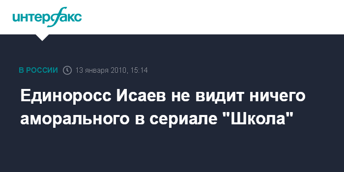 По его мнению, сериал "Школа" представляет "достаточно талантливо снятый фильм". "Конечно, он (сериал - ИФ) показывает реальные проблемы современной школы, молодежи, но, как говорится, нечего на зеркало пенять, нужно просто понять, что существуют проблемы", - сказал Исаев.