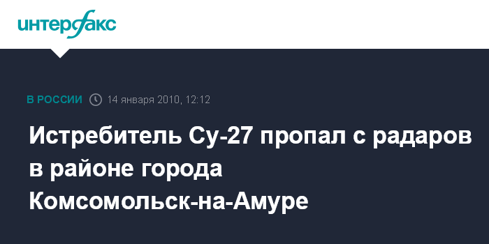 В свою очередь, в Управлении пресс-службы и информации Минобороны РФ "Интерфаксу-АВН" сообщили, что в Хабаровском крае во время планового полета пропала связь с истребителем Су-27 Дальневосточной армии ВВС и ПВО. "В четверг в 9:27 МСК на экранах радиолокаторов пропала отметка от самолета Су-27, который выполнял плановый полет с аэродрома Дземги под Комсомольском-на-Амуре", - сообщил представитель Минобороны.