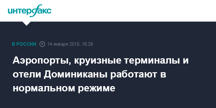 Как отмечается в заявлении, все 8 международных аэропортов Доминиканской Республики, круизные терминалы и морские порты, пляжи, отели и курортные зоны работают в обычном режиме. На данный момент не зарегистрированы отмены рейсов или групповых туров. "Доминиканская Республика не пострадала от землетрясения, и все транспортные, коммуникационные системы, туристические зоны и медицинские центры работают в нормальном режиме. Страна готова оказать необходимую помощь и поддержку пострадавшим.", - говорится в документе.
