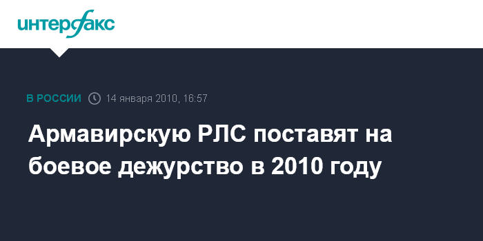 Москва. 14 января. INTERFAX.RU - Командующий Космическими войсками генерал-майор Олег Остапенко заявил в четверг журналистам, что РЛС предупреждения о ракетном нападении, построенная под Армавиром, будет поставлена на боевое дежурство в 2010 году. "В феврале 2009 г. станция поставлена на опытно-боевое дежурство. Она успешно прикрывает сектор, который раньше прикрывали украинские станции, расположенные в Мукачево и Севастополе. Думаю, во второй половине 2010 года станция будет поставлена на боевое дежурство. Ни секунды в этом не сомневаюсь", - сказал Остапенко.
