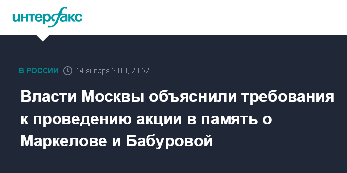 Москва. 14 января. INTERFAX.RU - Власти Москвы смогут санкционировать проведение демонстрации в память об убитых год назад адвокате Станиславе Маркелове и журналистке Анастасии Бабуровой, только если общественные организации представят заявку в соответствии с законом.