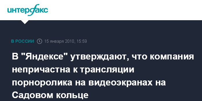 Москва. 15 января. INTERFAX.RU – Пресс-секретарь компании "Яндекс" Очир Манджиков прокомментировал ситуацию с роликами, которые транслировались на уличных щитах на Садовом кольце, и содержали видео порнографического характера.