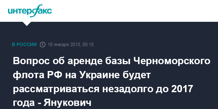 Киев. 16 января. ИНТЕРФАКС-УКРАИНА - Вопрос продления аренды базы Черноморского флота Российской Федерации в Крыму следует рассматривать незадолго до окончания срока действия договора о пребывании Черноморского флота Российской Федерации на территории Украины и в контексте обеспечения безопасности Украины, считает лидер Партии регионов, кандидат в президенты Украины Виктор Янукович.