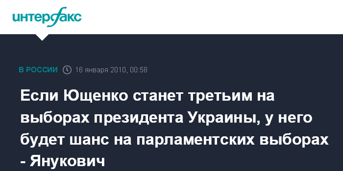 "Если он (Ющенко - ИФ) займет третье место, то у него будет перспектива на парламентских выборах получить достаточное количество голосов, чтобы получить приличное количество мест в парламенте, и он будет действующим политиком, игроком в парламенте", - сказал В.Янукович