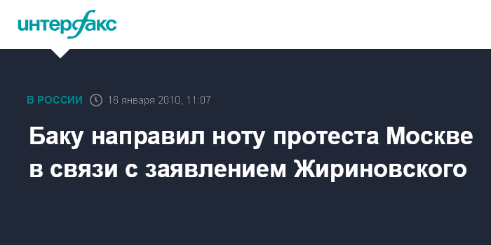 Баку. 16 января. INTERFAX.RU - Посольство Азербайджана в России направило в МИД РФ ноту протеста в связи с заявлением вице-спикера Госдумы Владимира Жириновского о возможности признания Москвой независимости Нагорного Карабаха, сообщил агентству "Интерфакс-Азербайджан" в субботу пресс-секретарь МИД Азербайджана Эльхан Полухов. "Посольство Азербайджана в Москве направило ноту протеста в МИД России в связи с заявлением В.Жириновского, в котором звучит призыв к признанию оккупированных армянскими вооруженными силами азербайджанских территорий", - сказал Э.Полухов.