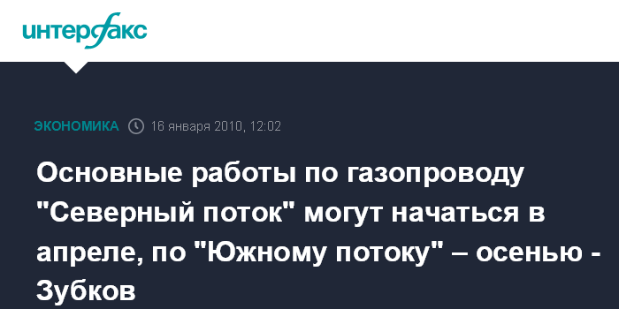Берлин. 16 января. INTERFAX.RU - Первый вице-премьер РФ, председатель совета директоров "Газпрома" Виктор Зубков считает, что крупномасштабные работы по газопроводу "Северный поток" начнутся в апреле этого года, по "Южному потоку" - осенью. "По "Северному потоку" идут подготовительные работы в части заказов на трубную продукцию, компрессорную станцию", - сообщил В.Зубков журналистам в Берлине в субботу. "Но основные крупномасштабные работы, как я чувствую, могут начаться в апреле, к этому идет большая подготовка", - сказал он. Касаясь газопровода "Южный поток", первый вице-премьер заявил, что в этом проекте "все идет достаточно неплохо". Все документы готовятся к тому, чтобы с осени приступить к конкретной работе по "Южному потоку", сказал он.