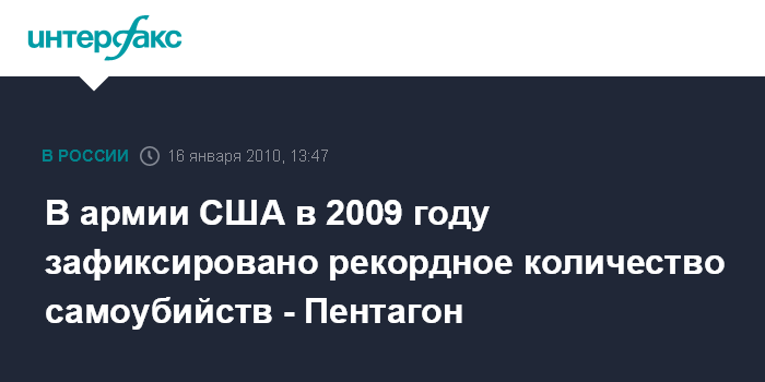 Вашингтон. 16 января. INTERFAX.RU - Количество самоубийств в вооруженных силах США в 2009 году поставило рекорд, увеличившись до 160 по сравнению с 140 суицидами в 2008 году, сообщает интернет-сайт газеты "Майами геральд" со ссылкой на информацию, опубликованную американскими военными. "Нет сомнений, что, если говорить о самоубийствах, 2009 год стал очень болезненным для вооруженных сил", - заявил представитель подразделения по борьбе с суицидами в вооруженных силах США полковник Кристофер Филбрик. Как отмечается в докладе Пентагона, основной причиной роста количества суицидов стала депрессия среди военнослужащих, вызванная напряжением от многолетних военных операций в Ираке и Афганистане.