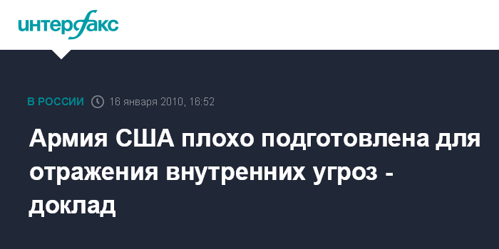 Вашингтон. 16 января. INTERFAX.RU - Вооруженные силы США достаточно плохо подготовлены к отражению внутренних угроз собственной безопасности, приводит в субботу газета "Нью-Йорк таймс" мнение авторов доклада об обстоятельствах стрельбы на военной базе в Техасе, устроенной майором вооруженных сил США Нидалем Маликом Хасаном. В сообщении отмечается, что доклад, опубликованный в пятницу, свидетельствует о многочисленных недоработках в системе безопасности в войсках. В частности, отмечается в документе, Н.М.Хасану, в результате действий которых на базе Форт-Худ погибли 13 человек, удалось дослужиться до звания майора, несмотря на то, что руководство неоднократно выражало обеспокоенность его поведением.