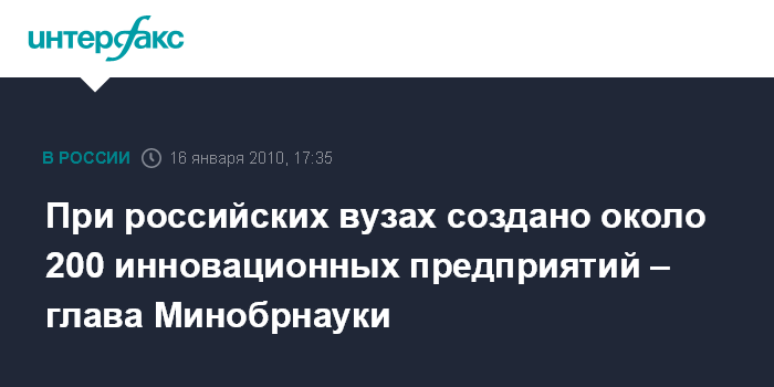 Ново-Огарево. 16 января. INTERFAX.RU - В России уже создано порядка 200 малых высокотехнологичных инновационных предприятий при вузах, сообщил глава Минобрнауки Андрей Фурсенко на встрече с премьер-министром РФ Владимиром Путиным. "Соответствующие решения приняты, и теперь важно, чтобы они были реализованы на практике", - сказал В.Путин, попросив А.Фурсенко доложить о том, как развивается ситуация. "По нашим оценкам, порядка 200 малых предприятий уже создано. Я могу назвать среди городов, в которых этот процесс при вузах наиболее активно идет, - Томск, Чебоксары, где не так давно первые предприятия заработали", - отметил глава Минобрнауки.
