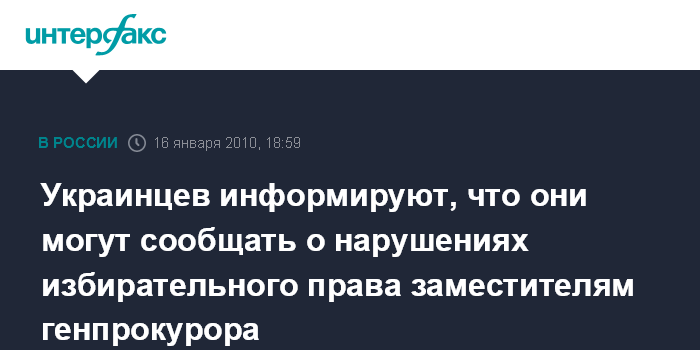Киев. 16 января. INTERFAX.RU - В субботу, 16 января, и непосредственно в день выборов, 17 января, о резонансных фактах нарушения избирательного законодательства можно сообщить заместителям генерального прокурора Украины.