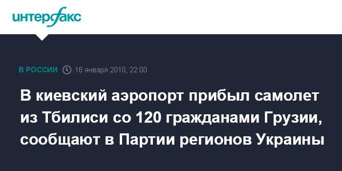 Киев. 16 января. ИНТЕРФАКС-УКРАИНА - В международный аэропорт "Борисполь" в субботу прибыл самолет грузинских авиалиний со 120 пассажирами на борту, сообщила агентству "Интерфакс-Украина" народный депутат Елена Бондаренко (Партия регионов).